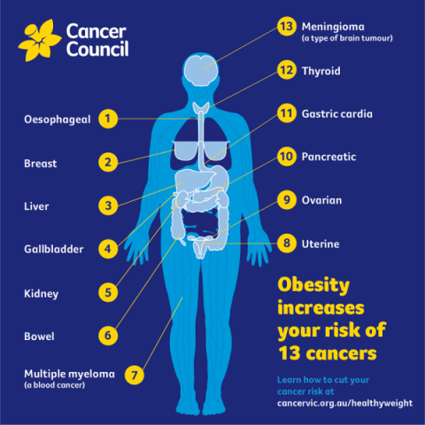 在澳大利亞,體重超過健康體重、飲食不良和缺乏體育鍛煉是繼煙草和紫外線照射之後最重要的可改變癌症風險因素。 肥胖與癌症之間的聯繫很複雜。 然而,有強有力的證據表明,超過健康體重是某些癌症的危險因素。 過多的身體脂肪(尤其是腰部和重要器官周圍的有毒或內臟脂肪)會導致更多的化學物質和激素被釋放。 它也可能導致炎症。