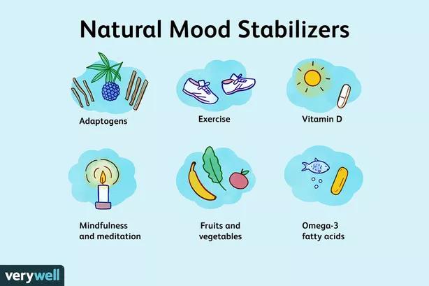 適應原、運動、營養、冥想或正念、omega-3 脂肪酸和維生素 D 是天然情緒穩定劑的一些例子。